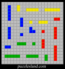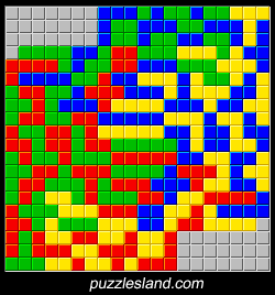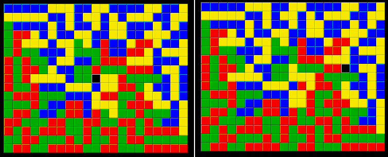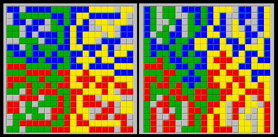 In December, 2009, two more 21x17's were found. These two differ only the middle, where the yellow square and Z are switched, along with red 1, 2, and I3 pieces. This yields one symmetric and one slightly asymmetric solution. Asymmetric solutions are much more difficult to find.