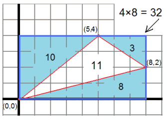 If the points define a horizontal or vertical line, This is much simpler than using trigonometric functions or Heron's formula. Here is an example: The points are (0,0), (5,4), and (8,2). The three right triangles have areas of (5*4)/2 = 10, (2*3)/2 = 3, and (8*2)/2 = 8. Those total 21, which when subtracted from the enclosing 4 * 8 = 32 rectangle, leaves an area of 11 for the given triangle.